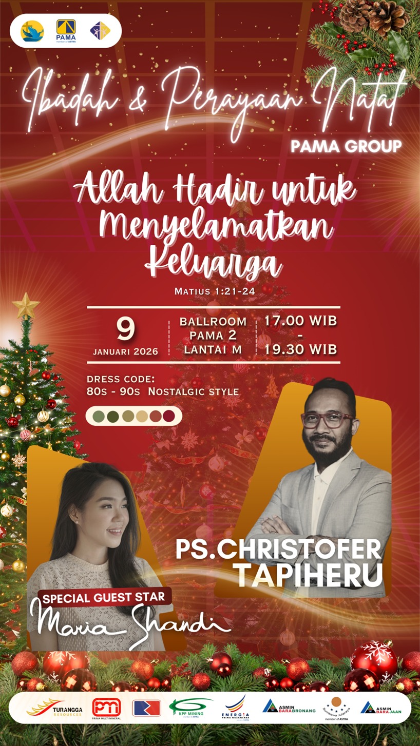 Turut mengundang Rekan rekan Kristiani dan Katolik Persekutuan Doa PAMA Groupuntuk menghadiri Ibadah dan perayaan Natal Pama Group 2025Dengan tema " Allah Hadir untuk menyelamatkan Keluarga "Natal Pama Group 2025 yang akan dilaksanakan pada :Hari, tanggal :Jumat, 09 Januari 2026Waktu :17.00 WIB...