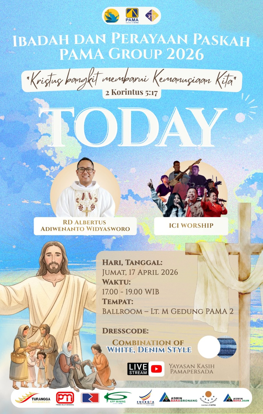 TODAYTurut mengundang Rekan rekan Kristiani dan Katolik Persekutuan Doa PAMA Groupuntuk menghadiri Ibadah dan perayaan Paskah Pama Group 2026Dengan tema " Kristus Bangkit membarui Kemanusiaan Kita "Paskah Pama Group 2026 yang akan dilaksanakan pada :Hari, tanggal :Jumat, 17 April 2026Waktu :17.00 WIB...
